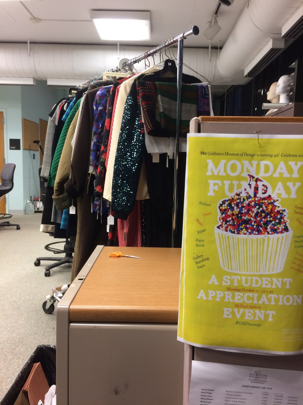 At the Goldstein Museum of Design (GMD) research center at the University of Minnesota College of Design, my office is walled off by a constantly-changing rack of multi-colored, garments. They are plain and extravagant, large and small, long and short, old and new. It is so much more exciting than a boring gray cubicle. I overhear students learning firsthand about the different fabric weaves and knits of these objects. I get to sit in on a surface design talk, examining a wide variety of patterns on scarves and textiles.