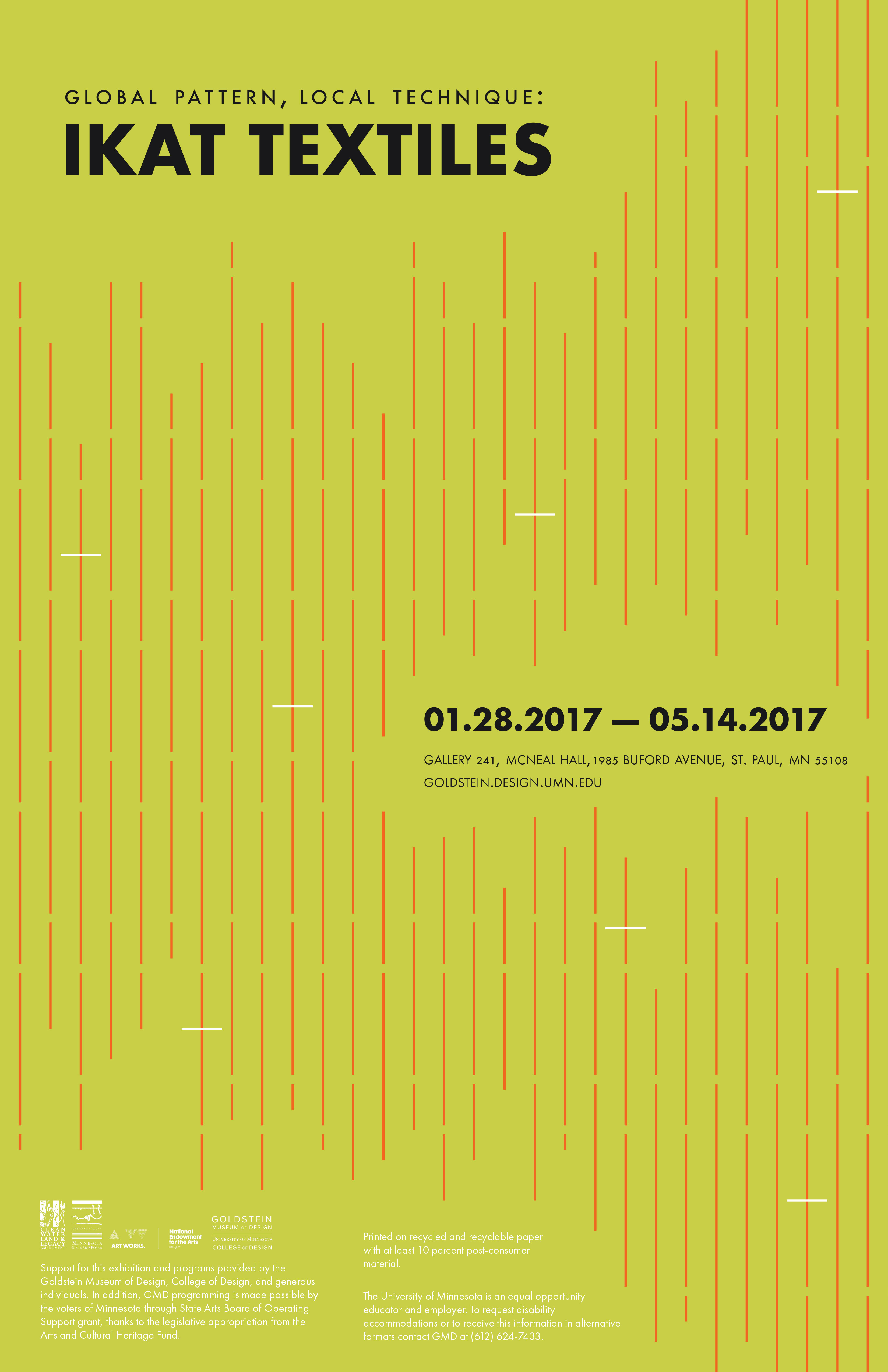 As the graphic designer at the Goldstein Museum of Design, I collaborated with College of Design professor Daniel Jasper and GMD curator Jean McElvain to lead students in the creation of an exhibition identity assignment. I then applied and adapted the chosen identity below to posters, postcards, a banner, window vinyls, and didactics for the exhibition.